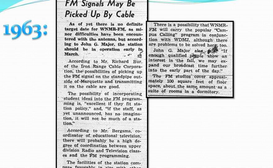 In 1963, WNMR purchased an old 250 watt transmitter from WJPD in Ishpeming which they loaded into a 400 watt light bulb to broadcast over the air, making WNMR the first FM radio station in Michigan's Upper Peninsula.