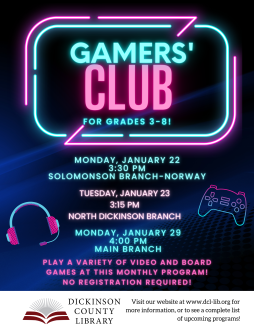 The Dickinson County Library helps the community find its story. All programs are free of charge, and you do not need to be a resident of Dickinson County or have a library card to attend. For more information on upcoming programs, please visit our website at www.dcl-lib.org!