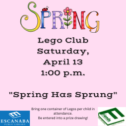 Come to Lego Club and enjoy some creative building time! Create something with the theme "Spring Has Sprung" or come up with your own idea.