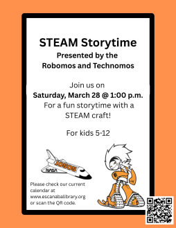 Join the Escanaba Robomos & Technomos for a STEAM Storytime on Saturday, March 28 at 1:00 p.m. at the Escanaba Public Library. This event is geared for children ages 5-12 and will include a STEAM craft. No registration is required for this free event.
