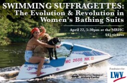 A beachside atmosphere will fill the Marquette Regional History Center on April 22, 2026, as the Marquette County League of Women Voters hosts its spring fundraiser: “Swimming Suffragettes: The Evolution and Revolution in Women’s Bathing Suits.” Carrie Moon-Dupree, Director of Development for the Michigan League, has been a longtime collector of vintage women’s swimsuits and has observed that their evolution parallels the progress of women’s rights. Tasty finger foods and luscious drinks will welcome guests at 6:00 p.m., and displays of the History Center’s vintage suits, along with photos of League members’ relatives in suits from their time, will entertain everyone until the presentation begins at 6:30 p.m. Members of the NMU Women’s Swim Team will help showcase the vintage suit collection as Moon-Dupree shares the lively story of how they relate to women’s evolving civil rights. Afterwards, Heidi Voigt, the coach of the NMU Women’s Swim Team, will demonstrate how women’s competitive swimwear has changed over the years as women’s participation in the sport has increased. There will be time for questions for both speakers, followed by some socializing over food and drinks before guests depart by 8:30 p.m.