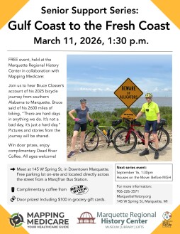 Join us to hear Bruce Closser’s account of his 2025 bicycle journey from southern Alabama to Marquette. Bruce said of his 2600 miles of biking, “There are hard days in anything we do. It’s not a bad day; it’s just a hard day.” Pictures and stories from the journey will be shared. Senior Support Series program includes door prizes, complimentary Dead River Coffee. All ages welcome. Free event, held in collaboration with Mapping Medicare. Visit marquettehistory.org or call 906.226.3571 for more information.