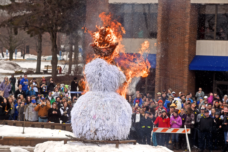 SAULT STE. MARIE, MI— Snow may still blanket the Upper Peninsula, but Lake Superior State University celebrated the spring equinox by burning a snowman Monday.